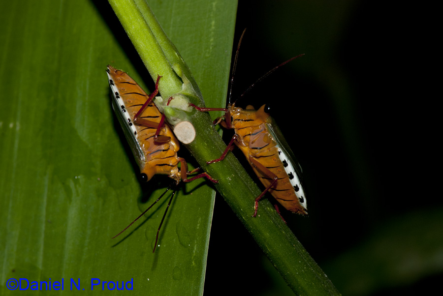 The oddly shaped shield bugs (Hemiptera: Pentatomoidea: Acantosomatidae) climb along a small limb. La Selva Biological Station, Costa Rica