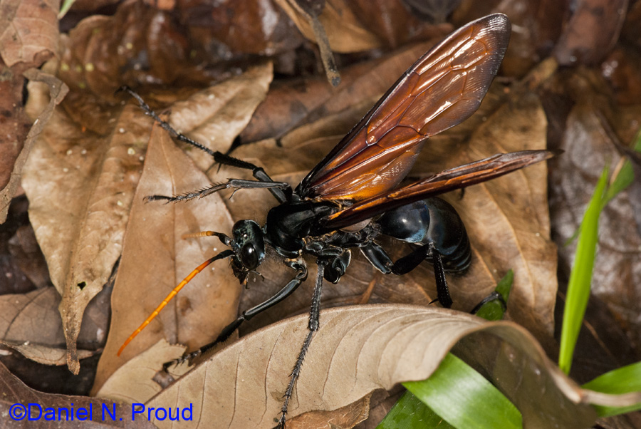 This wasp, the Tarantula Hawk (family Pompilidae), is a parasitoid wasp of tarantulas and is among the largest wasps. It attacks the tarantula, stings and paralyzes it, and lays an egg on the spider which develops into a larva and feeds on the spider internally until it hatches from the body ultimately killing the spider! Although not often aggressive towards humans (except when feeling threatened), the pain of the sting of this wasp is said to rival that of the bullet ant! Near Siquirres, Costa Rica