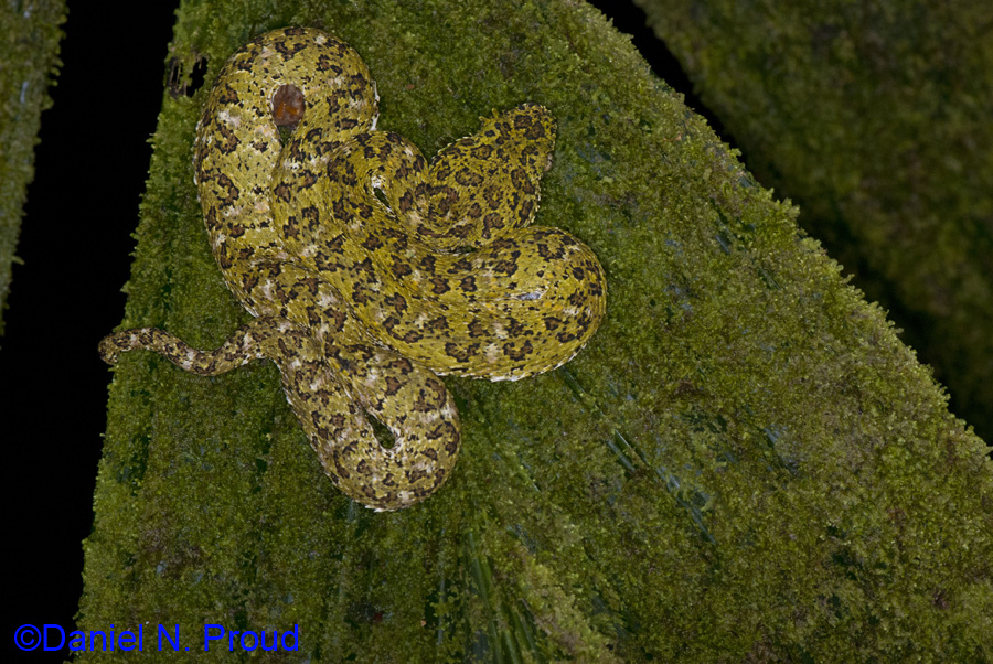 This cryptic Eyelash Viper (Viperidae) may easily be overlooked sitting atop a palm leaf about 3 feet above the ground – a regrettable mistake if you brush against it! Braulio Carrillo National Park, Costa Rica